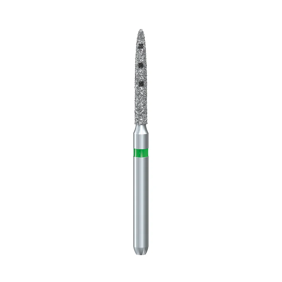 Diamond milling cutter, coarse grit with depth markers. ISO: 103 – Maximum Speed: 300,000 rpm – Shape: Flame – Diameter: 0.12 – Mandrel: Coarse Turbine – Grit Type: Coarse – Application: Preparation, Bopt Milling – Quantity per Package: 5 units