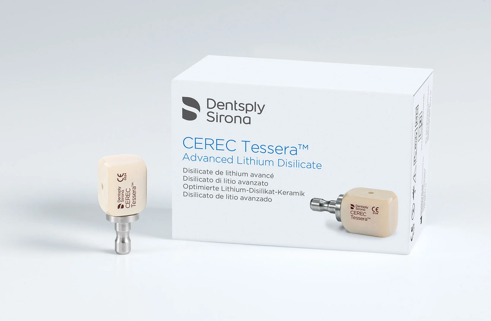 CEREC Tessera™ Advanced Lithium Disilicate Abutment Blocks are an all-ceramic system suitable for fabricating two-piece screw-retained hybrid implant restorations when cemented to prefabricated TiBase frameworks. CEREC Tessera™ Advanced Lithium Disilicate Abutment Blocks are high-strength (>700 MPa) advanced lithium disilicate CAD/CAM blocks with a densely packed, robustly reinforced, interlocking crystal composition that can be rapidly electroplated (in 4:30 minutes in the CEREC SpeedFire furnace) to produce highly esthetic TiBase implant restorations for both hybrid abutment and hybrid abutment crown designs.