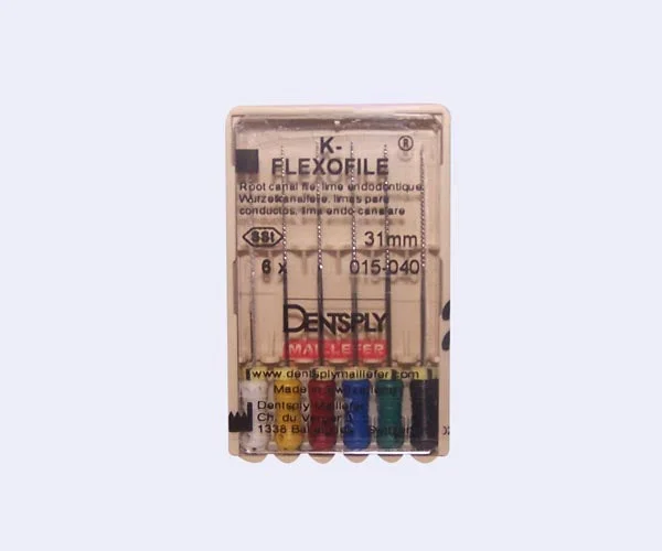 Flexofile files. Made of high-quality stainless steel and torsionally forged for superior fatigue resistance. Thanks to their progressive flexibility, the instrument follows the curve of the root canal to the apex. Triangular cross-section with excellent cutting capacity and improved chip removal.