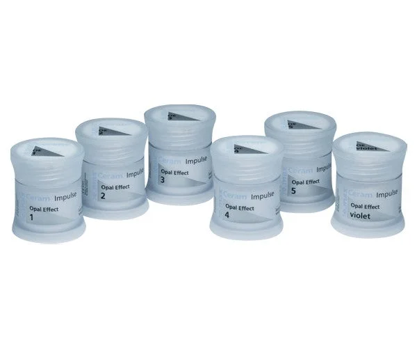 Opal Effect masses are available in six shades. Starting with Opal Effect 1, which offers greater natural opalescence and high translucency, the brightness gradually increases between Opal Effect 2 and Opal Effect 4. Opal Effect 5 displays the characteristic opal color. The Opal Effect ‘violet’ mass is used to reduce the brightness value in the incisal area.