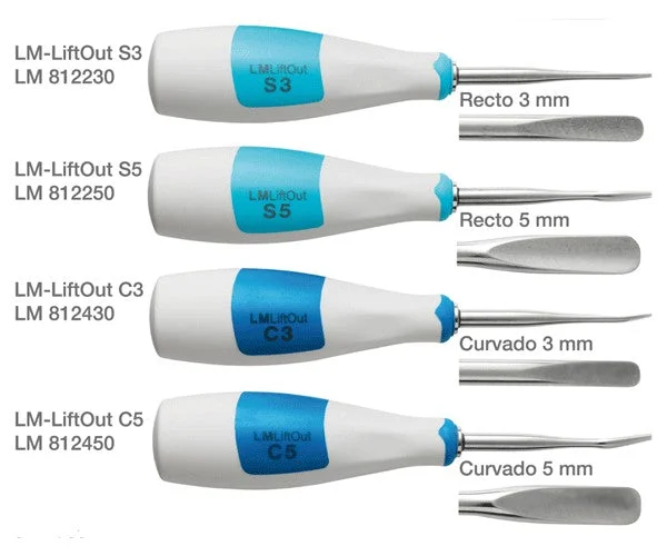 LM LiftOut luxation instruments. The LM LiftOut instrument allows for the extraction of teeth in the least traumatic way possible. This is crucial for achieving rapid healing and successful implant placement. The fine tip of the instrument is inserted into the periodontal space and slowly advanced toward the apex of the tooth root while the instrument is gently rotated back and forth. LM LiftOut is not suitable for use as an elevator lever.