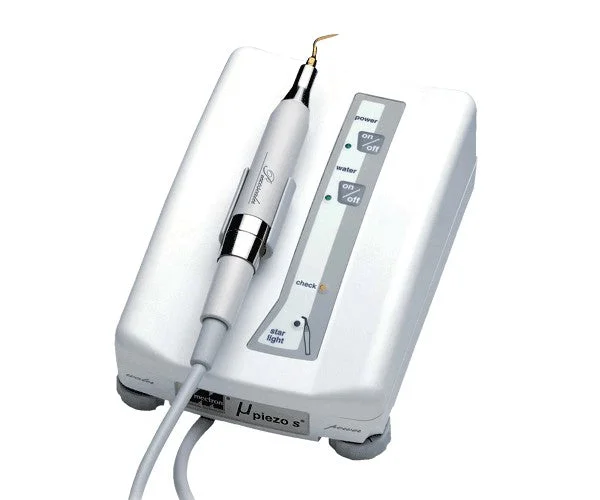 This compact piezoelectric tartar remover allows operation at the frequency of different tips (24,000 to 29,500 vibrations per second) while maintaining high performance. Micropiezo incorporates a FEEDBACK SYSTEM that automatically and continuously adjusts the power output based on the resistance encountered at the tip during treatment. The water supply can be shut off via the keypad. It features an externally removable water filter.