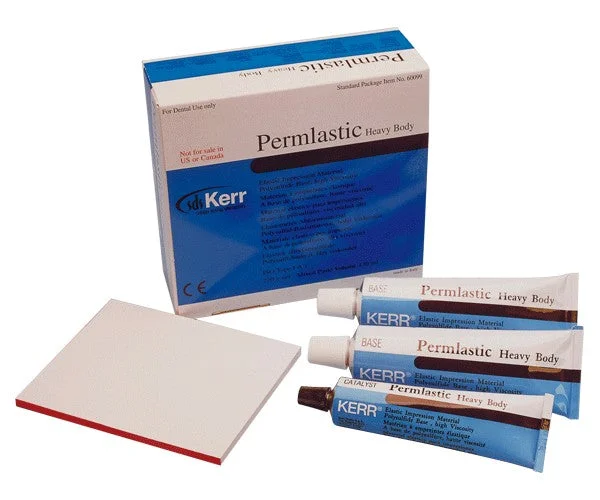 Permlastic is available in three viscosities. Light Body (fluid) is excellent for inlays and bridges. Regular Body is recommended for partial and full impressions. The dense viscosity of Heavy Body is optimal for compressing the fluid in the double impression or copper band technique. CONTENTS: 2 x 100 g base + 70 g catalyst + mixing block