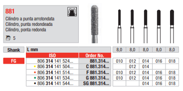 Fresa de Diamante o Diamantada FG.Caja 5 Uds. Forma Cilíndrica con punta redonda.